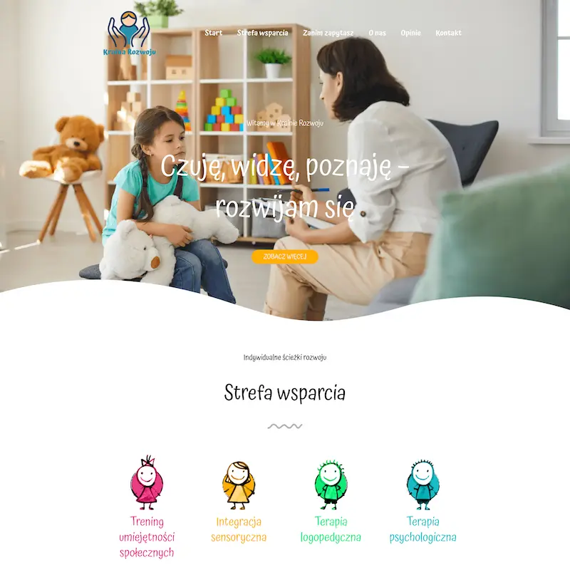 Kraina Rozwoju to miejsce stworzone z myślą o dzieciach i ich potrzebach rozwojowych, wspierając najmłodszych w budowaniu umiejętności społecznych, komunikacyjnych i emocjonalnych poprzez specjalistyczne terapie i zajęcia. W ramach projektu zrealizowano stronę www oraz materiały promocyjne.